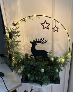 Op 15 december gingen 20 deelnemers van de workshop bloemschikken onder begeleiding van Ina en Grietje aan de slag met een ring, groen, een hert…