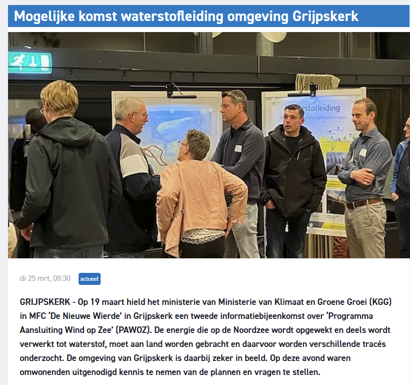 Er is een kans dat er iets ten noorden van ons dorp een waterstofleiding komt te liggen. Wat de impact daarvan is, kan nog niet goed worden ingeschat door de overheid en de Gasunie. U kunt nu echter al wel uw zienswijze laten horen. Lees het artikel over de informatieavond op: https://www.destreekkrant.nu/actueel/actueel/87587/mogelijke-komst-waterstofleiding-omgeving-grijpskerk, daaronder staat een afbeelding waarop is aangegeven, hoe u kunt reageren en waar u meer informatie kan vinden.
